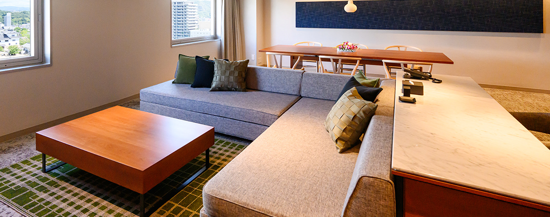 | 客室設備 | テレビ(リビング・ベッドルーム) / 衛星放送 / VOD / 電話 / インターネット接続(Wi-fi・有線LAN) / 携帯充電器 / 湯沸かしポット / お茶セット / 冷蔵庫 / ドレッサー / ドライヤー / ズボンプレッサー / 加湿機 能付空気清浄機 / ドライサウナ / 洗浄機付きトイレ(2ヵ所) / 消臭剤 / 電気スタンド(貸出) / アイロン(貸出) |