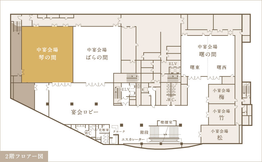 「クラシック&モダン」を基本デザインに、福山市が全国1位の産地である「琴」をモチーフに赤色とベージュを基調とした格調高い会場。特注シャンデリアの周囲には、演出可能な黄青緑の照明。会場内左右には間接照明の化粧パネル。正面化粧棚には「琴」「琵琶」「三味線」を模したユニークなガラス細工がライトアップされています。