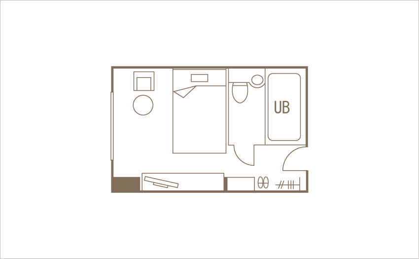 폭 140cm의 세미더블침대를 설치한 스탠더드 싱글룸.