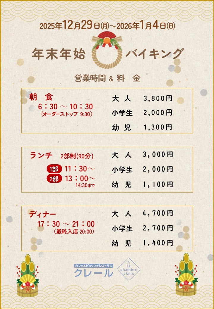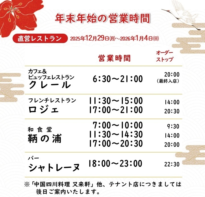 いつも福山ニューキャッスルホテルをご愛顧いただき、誠にありがとうございます。 年末年始期間の営業時間をご案内いたします。