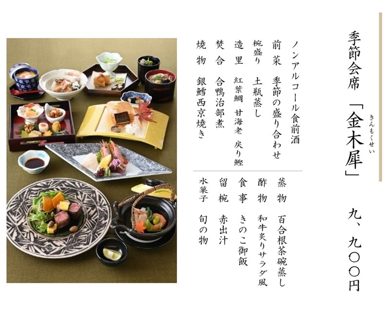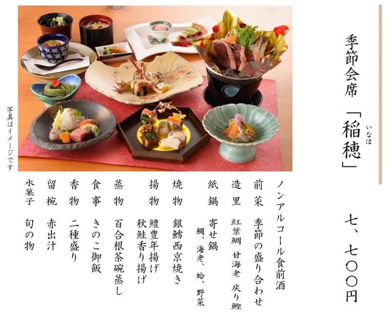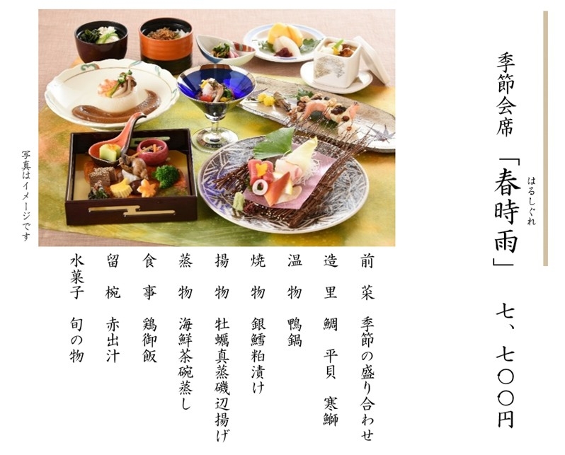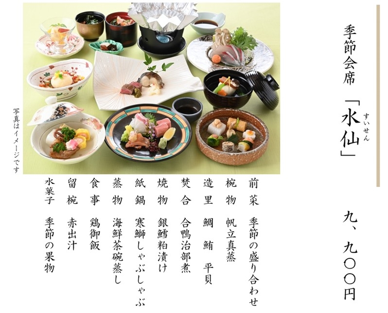 ※上記料金には、税金・サービス料を含みます。 ※仕入れの都合により、内容が変更になる場合があります。 ※上記写真はイメージです。 ※会合や接待、お祝いごとやご法要など、ご予算に応じた特別メニューもご用意いたします。お気軽にご相談ください。