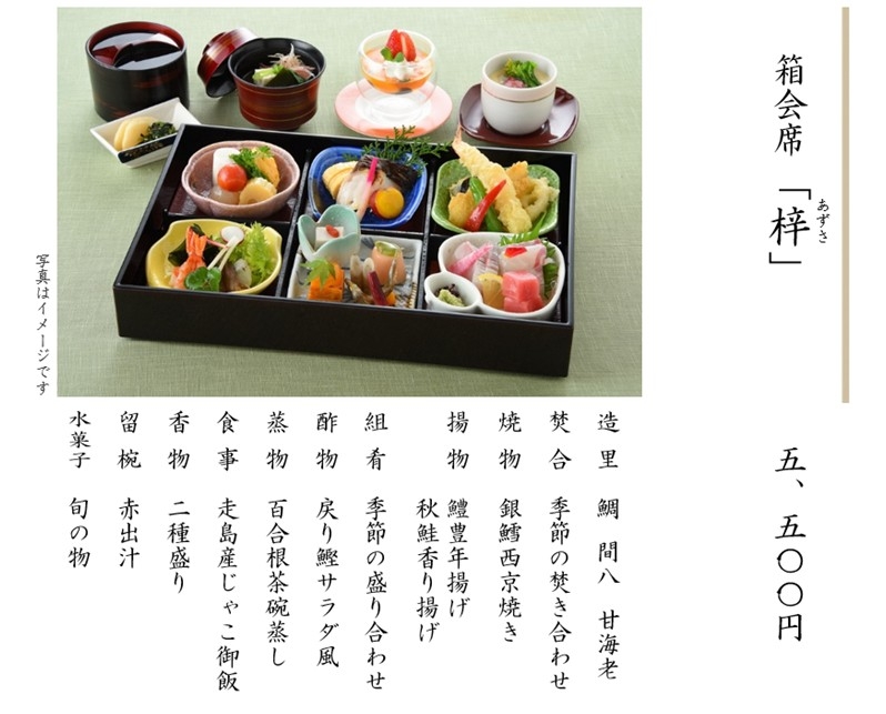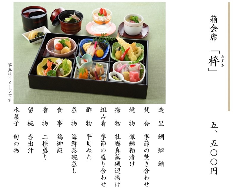 ※上記料金には、税金・サービス料を含みます。 ※仕入れの都合により、内容が変更になる場合があります。 ※上記写真はイメージです。 ※その他、ご予算に応じてお献立をお作りすることもできます。お気軽にスタッフにご相談ください。