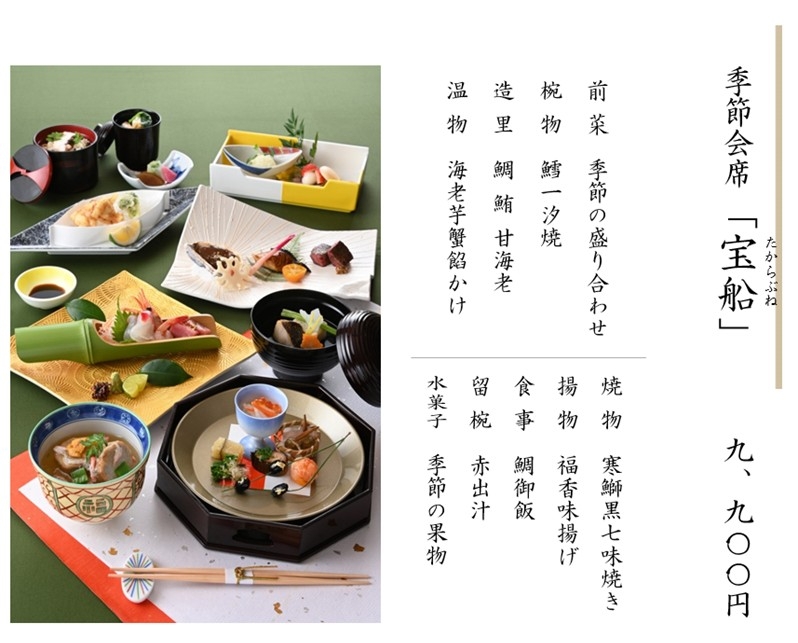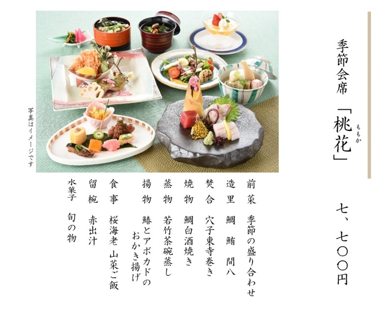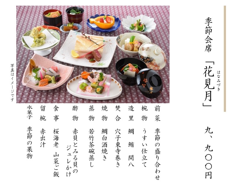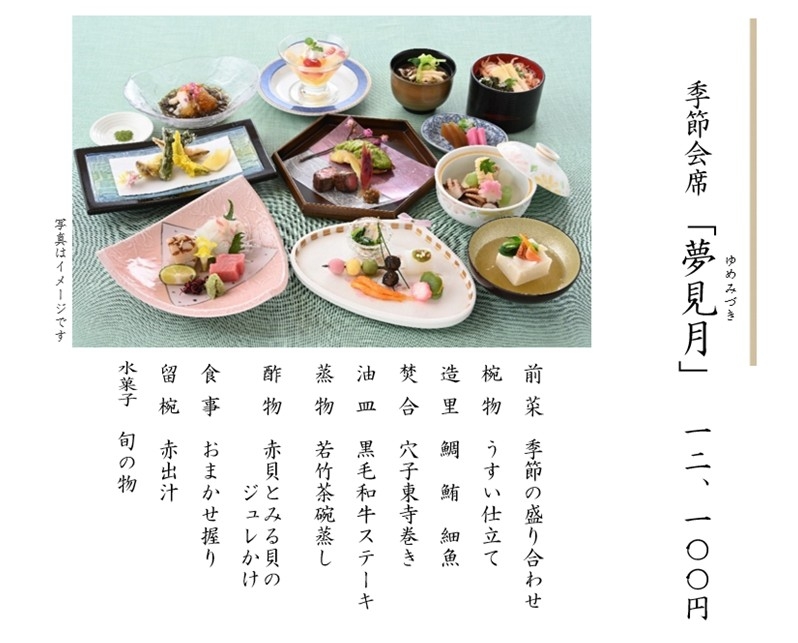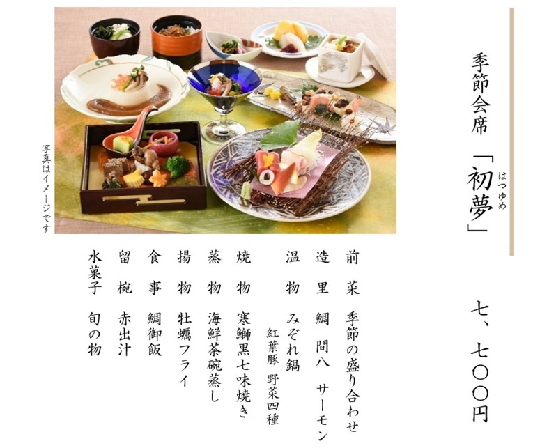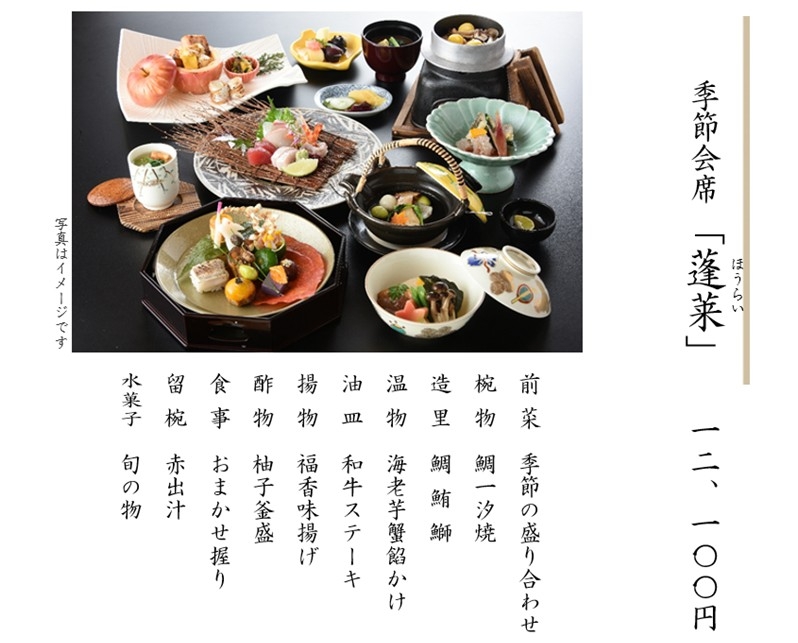 ※上記料金には、税金・サービス料を含みます。 ※仕入れの都合により、内容が変更になる場合があります。 ※上記写真はイメージです。 ※会合や接待、お祝いごとやご法要など、ご予算に応じた特別メニューもご用意いたします。お気軽にご相談ください。